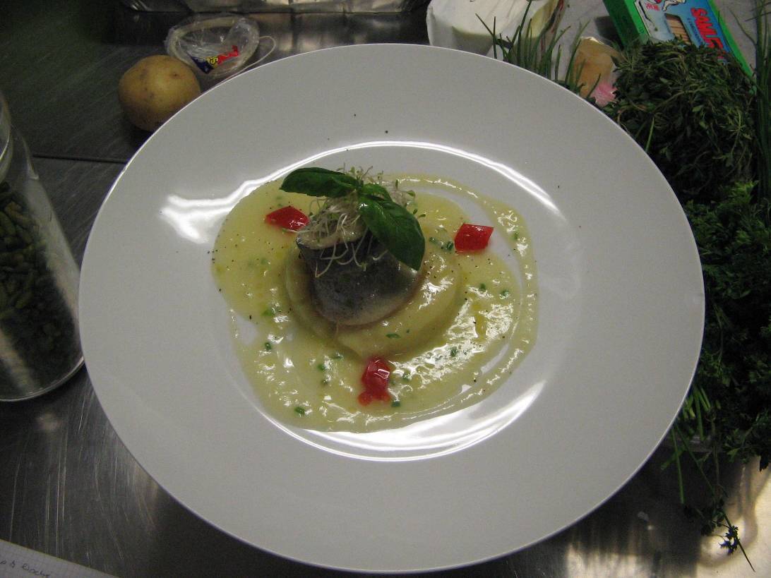 Ricciolo di Branzino, zabaione alle erbe, puré al limone