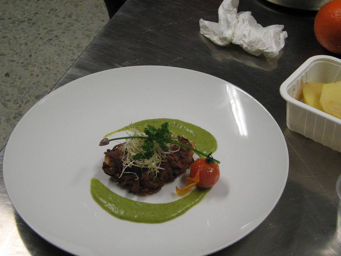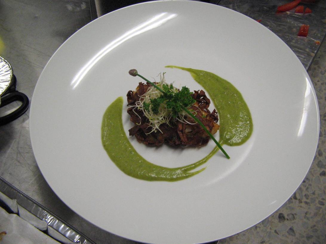 Trota salmonata in crosta di patate, maionese di zucchine e misticanze