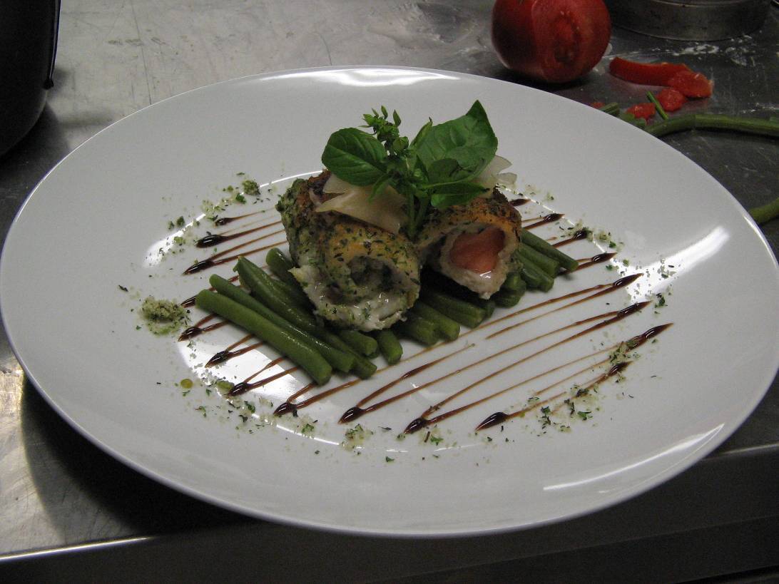 Preparare un pan carré passandolo al setaccio con i pistacchi, prima trinati e poi uniti al composto, salare e pepare i filetti di sogliola, adagiarvi al centro il cuore di salmone, arrotolare e legare con dello spago o uno stuzzicadenti. Passare i riccioli di sogliola prima nella farina poi nell'uovo e poi nel pane aromatico. Cuocere il tutto in padella antiaderente con olio extravergine e poco burro. Servirli con una salsa al caramello fatta con una riduzione di aceto balsamico e zucchero 50% per 50%