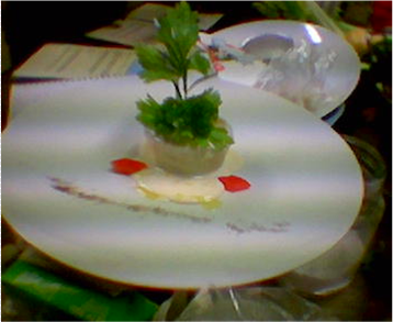 Composizione Servire lo sformato di patate e ricotta con la fonduta di taleggio, decorare con una sfoglia di pane sardo, rosmarino ed erba cipollina. (Si può profumare anche con dell'olio al tartufo e lamelle di tartufo bianco).
