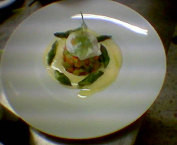 Composizione In una fondina, sfornare con uno stampo il pesto di verdura, sovrapporvi l'uovo pôché e salsare con la crema di parmigiano. Decorare con delle punte di asparago saltate in padella con olio extra vergine. |